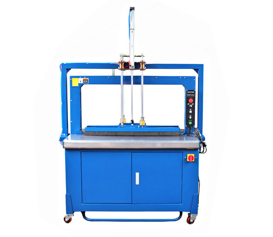 該機工作臺面配有動力輥筒,對打包物進行輸送,可實現(xiàn)自動傳動、自動檢測、自動打包,同時具有上壓功能,